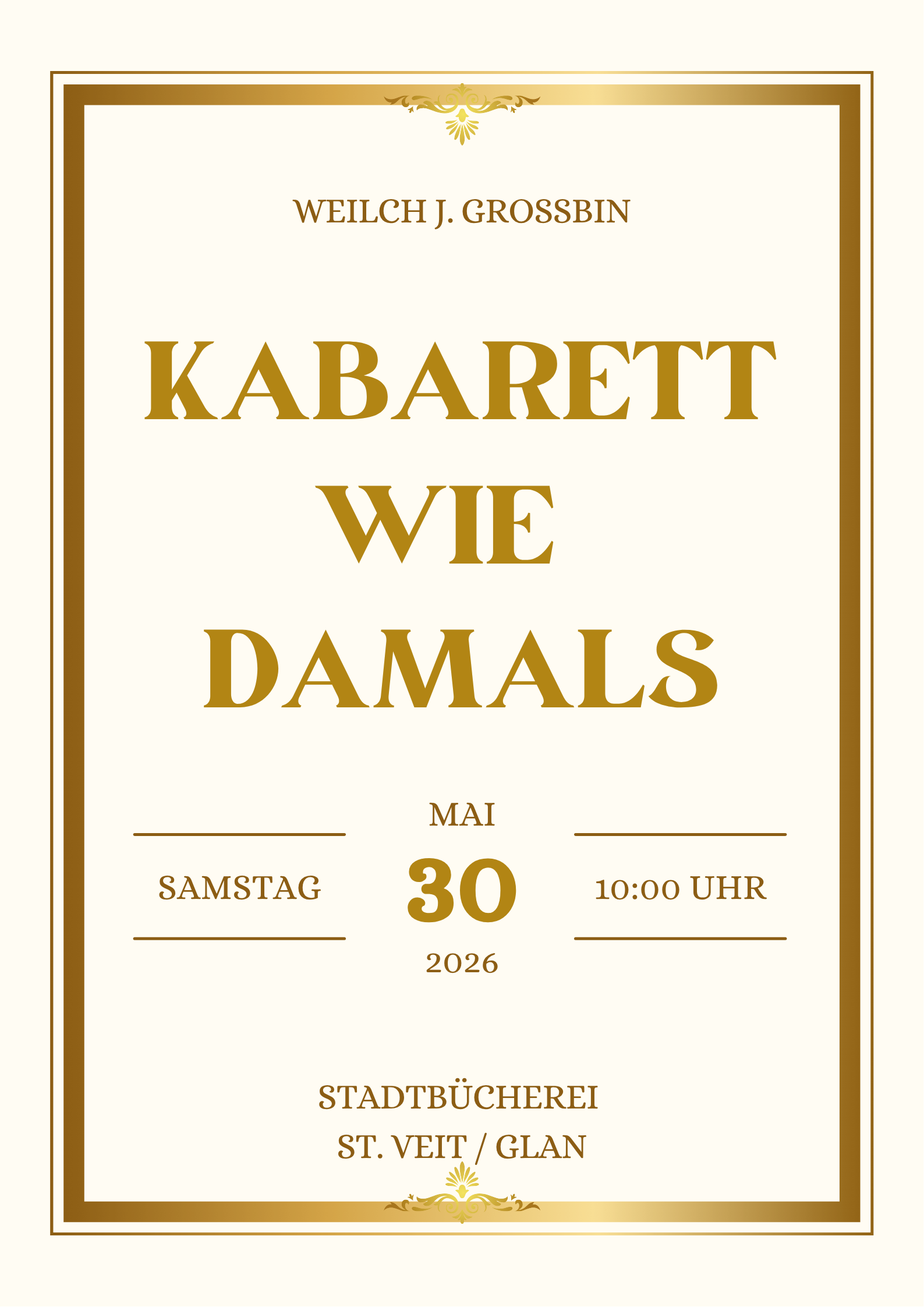 Am Samstag, den 30. Mai 2026, lädt die Stadtbücherei St. Veit/Glan zu einem besonderen Kabarettabend ein. Unter dem Titel „Wie damals“ präsentiert Weilch J. Grossbin ein unterhaltsames Programm voller Humor, Nostalgie und pointierter Beobachtungen.